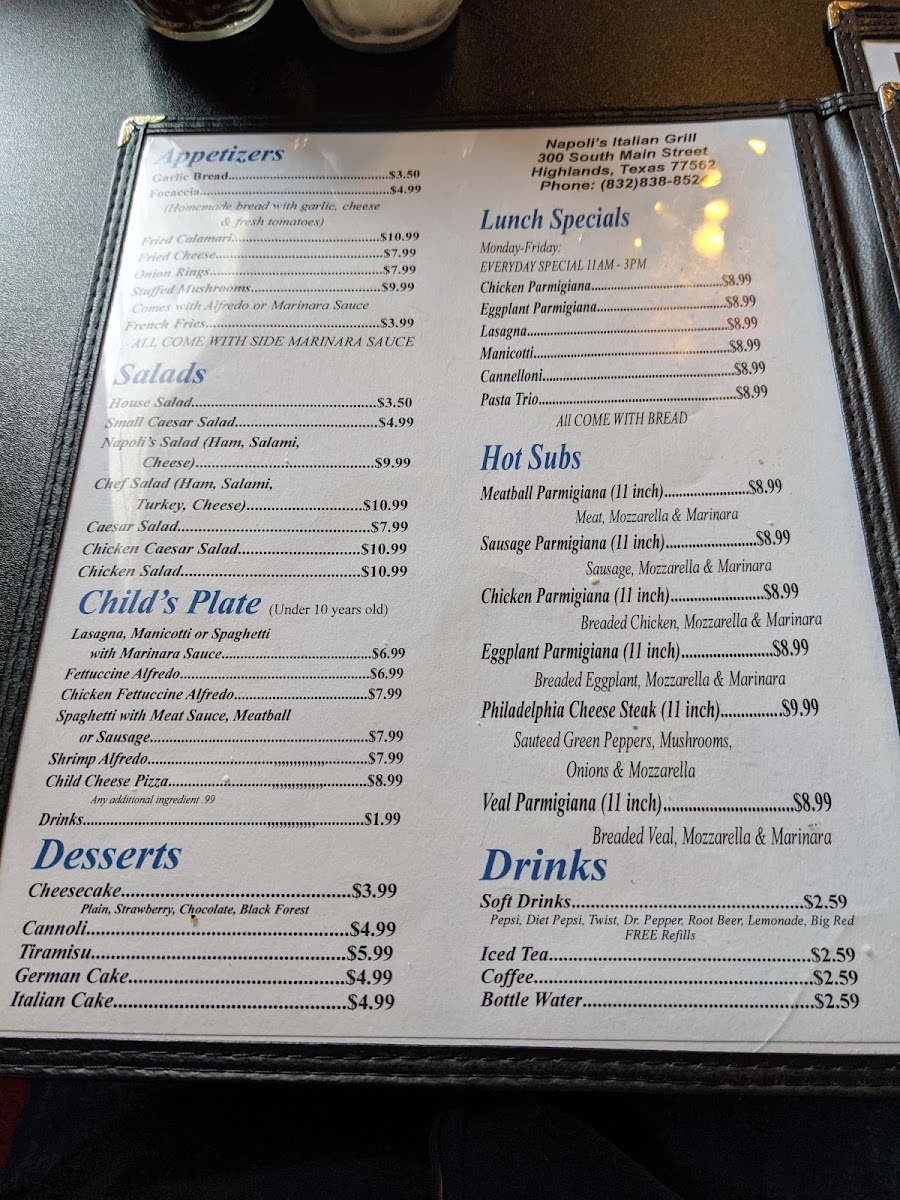 Welcome to Napoli's Italian Grill, a delightful culinary gem located at 300 S Main St, Highlands, TX. This cozy restaurant is celebrated for its authentic Italian cuisine and warm, familial service. The menu features classics that are crafted with fresh ingredients, making each dish a memorable experience.